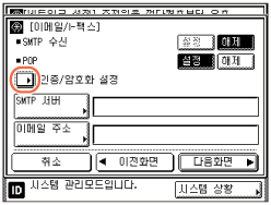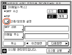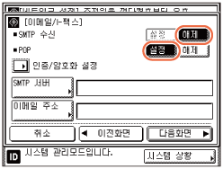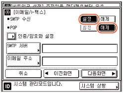 <POP>에 대해 [설정]을 누르고 → <SMTP 수신>에 대해 [해제]를 누릅니다.