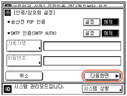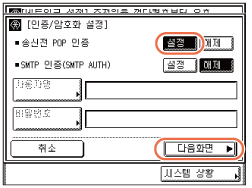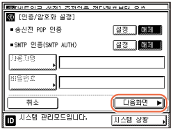<SMTP 인증(SMTP AUTH)>과 <송신 전 POP 인증>에 대해 둘다 [해제]를 누르고 → [다음화면]을 누릅니다.