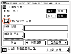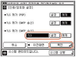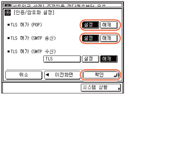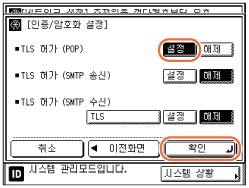 네트워크 환경에 따라 <TLS 허가 (POP)> 및/또는 <TLS 허가 (SMTP 송신)>을 [설정]을 누르고 → [이메일/I-팩스] 화면으로 돌아가려면 [확인]을 누릅니다.
