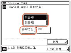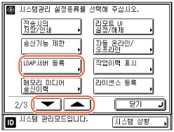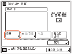 [LDAP 서버 등록]이 나타날 때까지 [] 또는 []를 누르고 → [LDAP 서버 등록]을 누릅니다.
