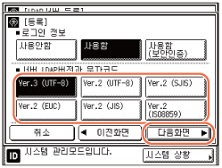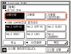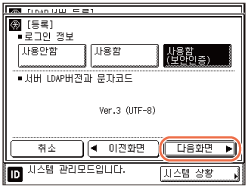 LDAP 서버의 환경에 따라 LDAP 버전 및 문자 코드를 선택하고 → [다음화면]을 누릅니다.
