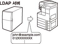 Lightweight Directory Access Protocol) 서버에 대한 정보가 기기에 등록된 경우 LDAP 서버를 통해 이메일 주소 및 팩스 번호를 검색할 수 있습니다. 서버를 통해 얻은 이메일 주소 및 팩스 번호를 수신인으로 지정하거나 주소록에 저장할 수 있습니다.