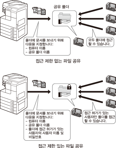스캔한 문서를 Windows 공유 폴더로 보내려면 기기에서 파일 송신 기능을 설정해야 합니다. 자세한 내용은 기기의 파일 송신 기능 설정(SMB 설정)을 참고하십시오.