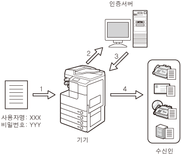 네트워크에서 Active Directory 등 디렉토리 서비스를 사용하는 경우 인증된 송신도 사용하는 것이 좋습니다. 인증된 송신은 권한이 없는 사용자가 문서를 기기에서 송신하는 것을 방지할 수 있도록 하는 인증 기능입니다. 이 기능이 활성화된 경우 문서를 송신하려는 사용자는 유효한 사용자 이름 및 비밀번호를 입력해야 합니다.