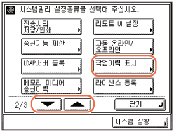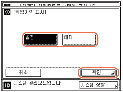터치 패널 화면에 작업 이력을 표시할지 여부를 지정할 수 있습니다. [작업이력 표시]를 '설정'으로 지정하면 시스템 상황 화면을 사용하여 작업 이력을 확인할 수 있습니다. [작업이력 표시]를 '해제'로 설정하면 작업 이력이 시스템 상황 화면에 표시되지 않습니다.