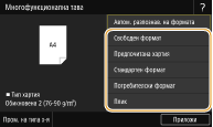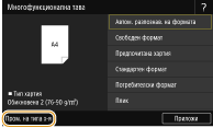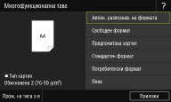 Можете да изберете размера на хартията като <Свободен формат>, което премахва необходимостта от въвеждане на настройките за размера на хартията. Задайте <Свободен формат>, когато зареждате хартия с неизвестен размер, която да се използва за копиране или когато размерът на хартията вече е регистриран в драйвера на принтера.