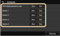 Разрешете или забранете функцията за автоматичен избор на източник на хартия за всеки източник на хартия. Ако функцията е с настройка <Вкл.>, устройството избира автоматично източник, в който е заредена хартия с подходящ формат за всяка задача за печат. Също така, когато хартията в избрания източник свърши, тази функция позволява отпечатването да продължи чрез превключване към друг източник на хартия, в който е заредена хартия със същия формат.