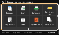 Можете да добавите бутони за пряк път в екрана Начало за често използвани функции, като например <Копиране>, <Факс> и <Сканиране>. Можете например да извършвате задачи по-бързо и ефективно, като присвоите последователност от настройки (например "сканиране на двете страни на оригинал, записване като силно компресиран PDF файл и изпращане по имейл") към един-единствен бутон.