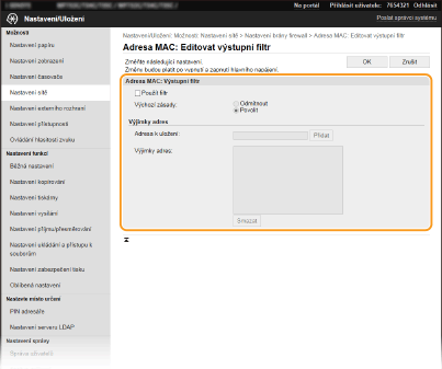 Zadáte-li adresy MAC nesprávně, nebude možné se k zařízení připojit prostřednictvím Vzdáleného uživatelského rozhraní. V takovém případě je třeba nastavit <Filtr adres MAC> na <Vyp>. <Filtr adres MAC>
