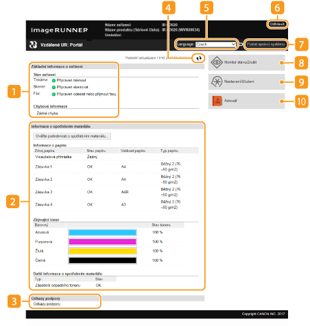Když se přihlásíte do Vzdáleného uživatelského rozhraní, objeví se následující stránka portálu. V této části jsou popsány položky zobrazené na stránce portálu a základní operace.