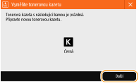 Pokud začne toner docházet nebo dojde úplně, zobrazí se zpráva upozorňující na nutnou přípravu nové tonerové kazety nebo provedení výměny tonerové kazety. Připravte novou tonerovou kazetu nebo proveďte výměnu tonerové kazety dle instrukcí v zobrazené zprávě.