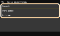 Možnost <Jemné nastav.> lze použít k nastavení sytosti toneru pro každou barvu na tři úrovně sytosti: vysoká sytost, střední sytost a nízká sytost.