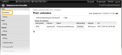 Klik på [Jobnummer] for at vise detaljerede oplysninger og et eksempel på et dokument, der venter på at blive udskrevet.