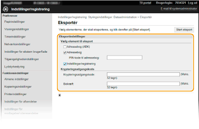 Hvis afkrydsningsfeltet [Adressebog (ABK)] er markeret, kan du ikke eksportere maskinens indstillinger samtidig med adressebogsdataene.