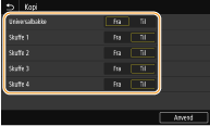 Angiv altid <Til> for mindst én papirskuffe. Hvis du angiver <Fra> for alle papirskufferne, kan du ikke færdiggøre indstillingsproceduren.