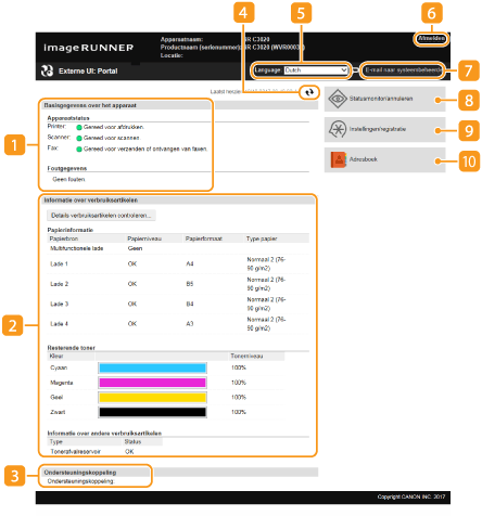 Als u inlogt op de UI op afstand, verschijnt de volgende portalpagina. Dit gedeelte beschrijft de items die op de portalpagina worden weergegeven en de basisbewerkingen.