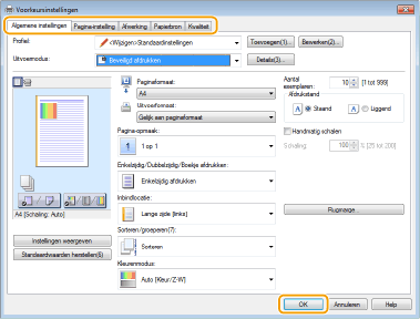 Selecteer het printerstuurprogramma voor dit apparaat en klik op [Voorkeursinstellingen] of [Eigenschappen].