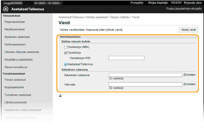 Jos [Osoitekirja (ABK)] -valintaruutu on valittu, et voi viedä laitteen asetuksia samaan aikaan osoitekirjan tietojen kanssa.