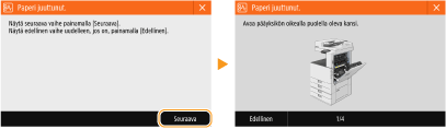 Joissakin tapauksissa, kun tapahtuu virhe, näytetään ohjeet virheen korjaamiseksi. Ratkaise ongelma noudattamalla näyttöön tulevia ohjeita. Alla näytetään esimerkkinä näyttö, joka tulee esiin, kun tapahtuu paperitukos.