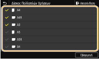 Αποεπιλέξτε τα πλαίσια ελέγχου που αντιστοιχούν στα μεγέθη χαρτιού που δεν θέλετε να εμφανίζονται.