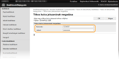 A készülékkel használni kívánt kulcs és tanúsítvány, valamint a hitelesítésszolgáltatói tanúsítvány a hitelesítésszolgáltatótól szerezhetők be. Telepítse és regisztrálja a készülékkel használni kívánt, korábban már beszerzett kulcsot és a tanúsítványfájlt, valamint a hitelesítésszolgáltatói tanúsítványfájlt a Távoli felhasználói felületet segítségével. Már előre ellenőrizze, hogy milyen feltételek megléte szükséges a készüléken a kulcs és a tanúsítvány, valamint a hitelesítésszolgáltatói tanúsítvány használatához. (