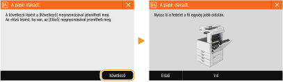 Amikor hiba lép fel, bizonyos esetekben a hiba elhárítására vonatkozó útmutatás jelenik meg a kijelzőn. A probléma megoldásához kövesse a kijelzőn látható utasításokat. Az alábbi ábrán például a papírelakadáskor megjelenő képernyő látható.
