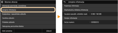 Pasirinkus <Būsenos mon.>, rodomas ekranas, kuriame galite peržiūrėti dokumentų bei aparato (dažomųjų miltelių lygį ir t. t.) būseną ir tinklo parametrus, pvz., aparato IP adresą.