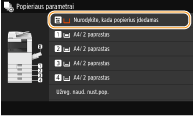 Jei numatytieji popieriaus parametrai įregistruoti, įdėjus popieriaus, parametrų ekranas nerodomas ir visada naudojami tie patys parametrai. Jei įdedate kitokio formato arba tipo popierių ir nepakeičiate parametrų, aparatas gali spausdinti netinkamai. Norėdami išvengti šios problemos, atlikdami 3 veiksmą pasirinkite <Nurodykite, kada popierius įdedamas>, tada įdėkite popierių.