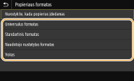 Popieriaus formatą galite nurodyti kaip <Universalus formatas>, tuomet nereikia įvesti popieriaus formato parametro. Nurodykite <Universalus formatas>, jeigu dedate nežinomo formato popierių, skirtą kopijuoti, arba kai popieriaus formatas jau užregistruotas spausdintuvo tvarkyklėje.