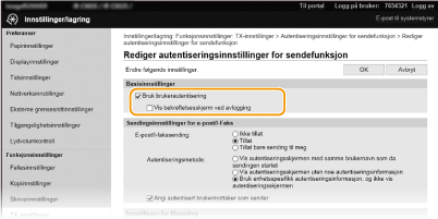 Ingen autentiseringsskjermbilde vises når e-poster eller I-fakser sendes. Autentisering på SMTP-serveren utføres med brukernavnet og passordet angitt i [Innstillinger for e-post/I-Fax] Konfigurere kommunikasjonsinnstillinger for e-post/I-faks.