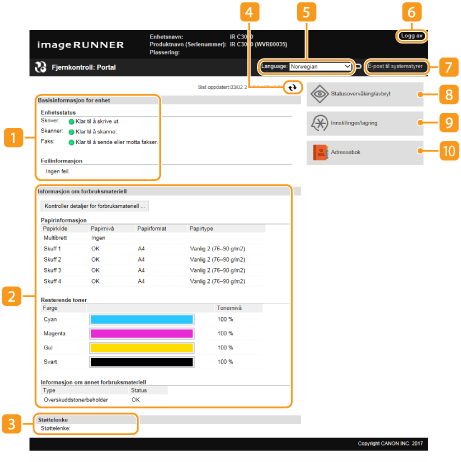Når du logger inn på Fjernkontroll, vises følgende Portalside. Denne delen beskriver elementene som vises på Portalsiden og de grunnleggende handlingene.