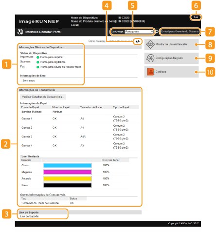 Quando inicia sessão na UI Remota, aparece a seguinte página do portal. Esta secção descreve os itens apresentados na página do portal e as operações básicas.