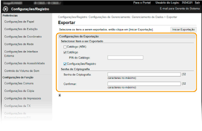Se a caixa de verificação [Catálogo (ABK)] estiver selecionada, não é possível exportar as definições da máquina ao mesmo tempo que os dados do livro de endereços.