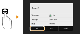 Dacă doriţi să anulaţi trimiterea faxurilor imediat după ce selectaţi <Start>, selectaţi <Revocare> de pe ecran sau apăsaţi de pe panoul de operare. De asemenea, puteţi anula trimiterea faxului după verificarea stării faxului.