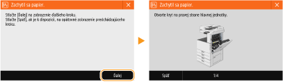 V niektorých prípadoch sa pri výskyte chyby zobrazia pokyny, čo máte robiť pri chybe. Problém vyriešite na obrazovke opísaným postupom. Nižšie je ako príklad zobrazená obrazovka, ktoré sa zobrazí pri zaseknutí papiera.