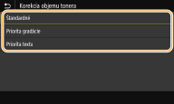 Pomocou položky <Jemné nastavenie> môžete nastaviť hustotu tonera každej farby na jednu z troch úrovní: vysoká hustota, stredná hustota nízka hustota.