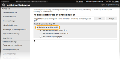Markera kryssrutan [Hantering av avdelnings-ID].