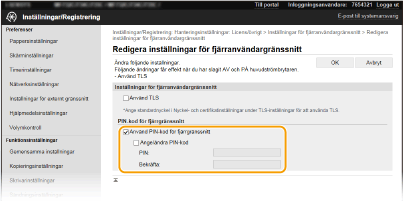 Använda kontrollpanelenDu har även åtkomst till inställningarna för Fjärranvändargränssnittets PIN-kod från <Meny> på skärmen Hem. <Inställningar f. fjärranvändargränssnitt>