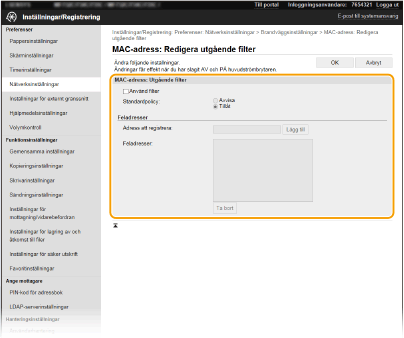 Om MAC-adresser anges felaktigt kanske du inte kan använda enheten från Fjärranvändargränssnittet och då måste du ställa in <MAC-adressfilter> på <Av>. <MAC-adressfilter>