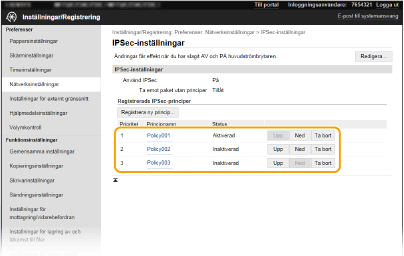 Använda kontrollpanelenDu kan också aktivera eller inaktivera IPSec-kommunikation från <Meny> på skärmen Hem. <Använd IPSec>