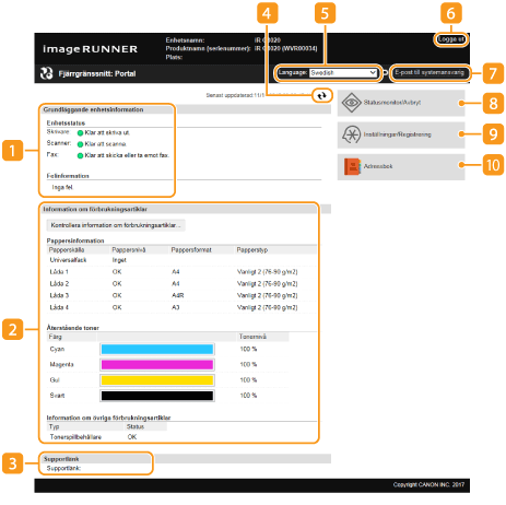 När du loggar in på Fjärranvändargränssnittet öppnas följande portalsida. Det här avsnittet beskriver objekten som visas på portalsidan samt grundläggande funktioner.