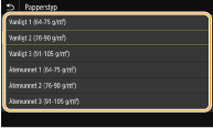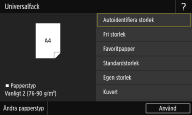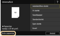 Om ovanstående skärm inte visas när papper fylls påOm du alltid fyller på samma papper i multiutmatningsfacket kan du hoppa över pappersinställningarna genom att registrera pappersformatet och -typen som standardinställningar. När standardinställningarna har registrerats visas emellertid inte ovanstående skärm. Om du vill visa skärmen väljer du <Ange när du matar in papper> (Bestämma pappersformat och vilken typ som ska användas med universalfacket).