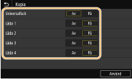 Ange alltid <På> för minst en papperslåda. Om du anger <Av> för alla papperslådor, kan du inte avsluta inställningsproceduren.