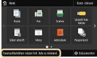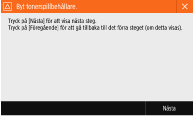 När tonerspillbehållaren är nästan full visas ett meddelande om att du ska förbereda en ny behållare eller byta ut behållaren. Förbered en ny tonerspillbehållare eller byt ut behållaren enligt det visade meddelandet.