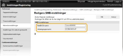 SMB (Server Message Block) är ett protokoll för att dela resurser, till exempel filer och skrivare, med mer än en enhet i ett nätverk. Enheten använder SMB för att lagra skannade dokument i en delad mapp. Beroende på nätverket behöver du eventuellt ange NetBIOS-namn och arbetsgruppsnamn.