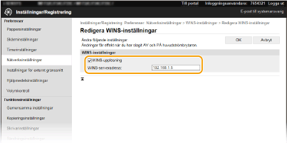 Välja inställningar från kontrollpanelenWINS-inställningar kan också nås från <Meny> på skärmen Hem. <WINS-inställningar>