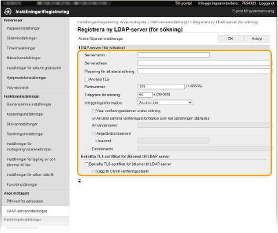 Om en LDAP-server är implementerad i nätverket kan du söka i servern efter faxnummer eller e-postadresser och sedan ange dem som mottagare eller registrera dem i adressboken. Lägg även märke till att om autentiseringen av sändfunktionen ( LDAP-serverautentisering) är aktiverad måste du registrera servern som används för autentisering. Du kan registrera upp till fem LDAP-servrar var för sökning och för autentisering på enheten. Registrera LDAP-servrar via Fjärranvändargränssnittet.