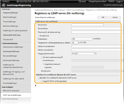 Markera kryssrutan för att verifiera certifikatet när du vill använda TLS för att kryptera kommunikationen med LDAP-servern. Markera även kryssrutan [Lägg till CN till verifieringsobjekt] om det behövs.
