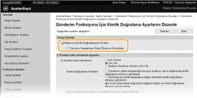 Yetkili Gönderme oturum açma ekranına girilen kullanıcı adı ve parolayı kullanarak sunucuda kimlik doğrulamasını gerçekleştirir. [Kullanıcı Kimlik Doğrulamasını Kullan] onay kutusu seçilirse, siz verileri gönderirken önceden girdiğiniz kullanıcı adı ve parolayı içeren kimlik doğrulama ekranı görüntülenir.