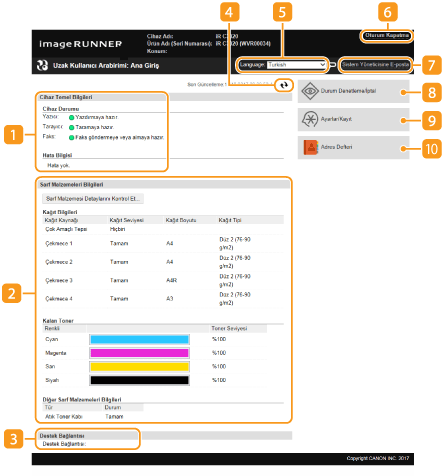 Uzak Kullanıcı Arabiriminde oturum açtığınızda, aşağıdaki Portal sayfası görüntülenir. Bu bölümde, Portal sayfasında görüntülenen öğeler ve temel işlemler açıklanmaktadır.